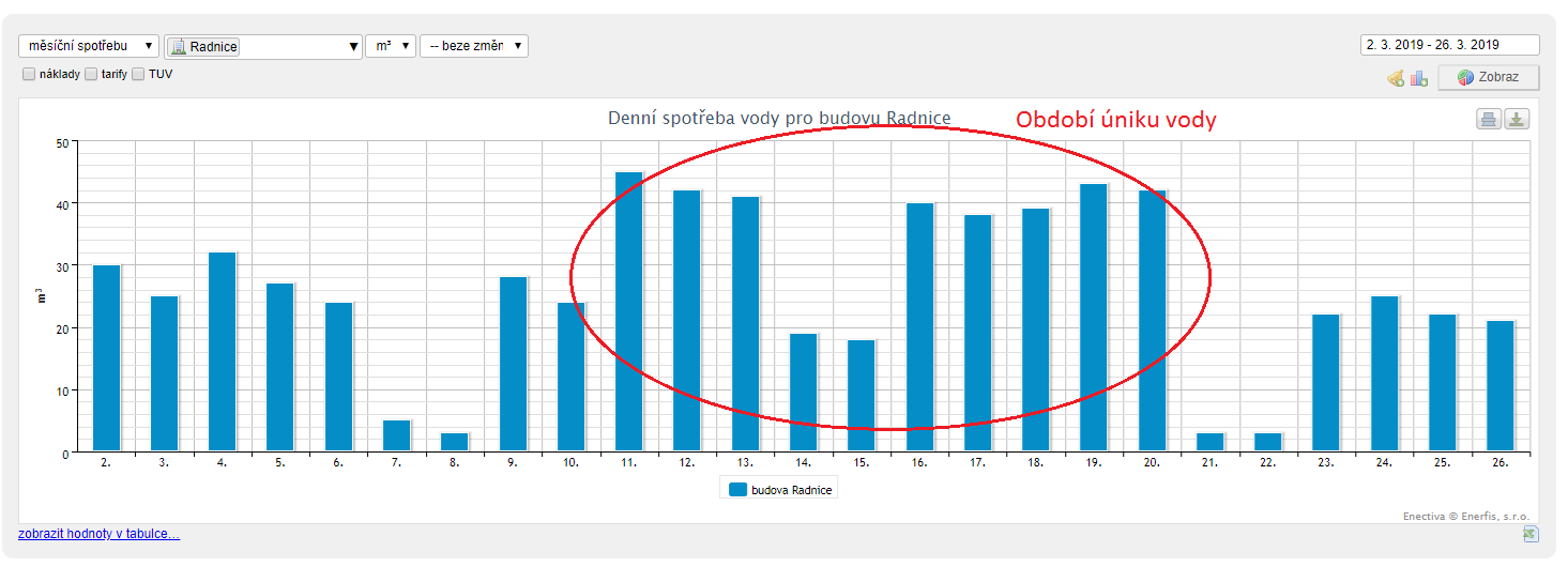 V budově radnice nastala nehoda a 11. 3. začalo unikat 15 m3 vody denně. Enectiva zaznamenala přesáhnutí limitů a ihned kontaktovala správce, který zavolal instalatéry. Celková cena za únik: 1 200 Kč za uniklou vodu (při ceně 80 Kč za vodné a stočné za 1 m3). Majetkové škody jsou v tomto případě minimální. Článek o tom jak si nastavit automatická upozornění je k přečtení zde: Nastavení upozornění.